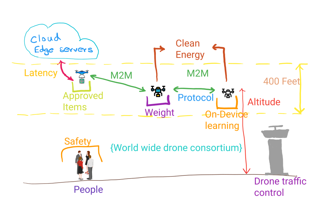 1) How would the air space be allocated? – Every country maintains an entity to allocate and monitor the airspace. It would be interesting to know how the airspace would be allocated for commercial drone deliveries and operators. Will there be a time slice on usage? or Will different operators be allocated different altitudes? Or Will there be a central agency like Drone Traffic Control for monitoring?