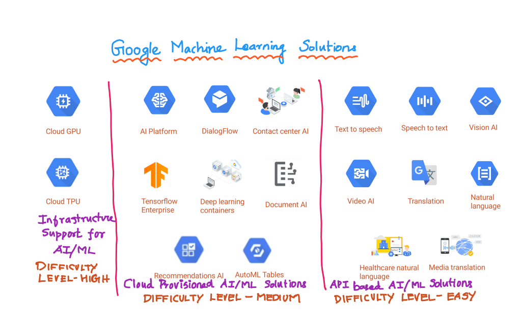 Google solutions and offerings can be broadly classified into 3 main categories. I have also grouped this based on the difficulty level of developers to adopt and start using –