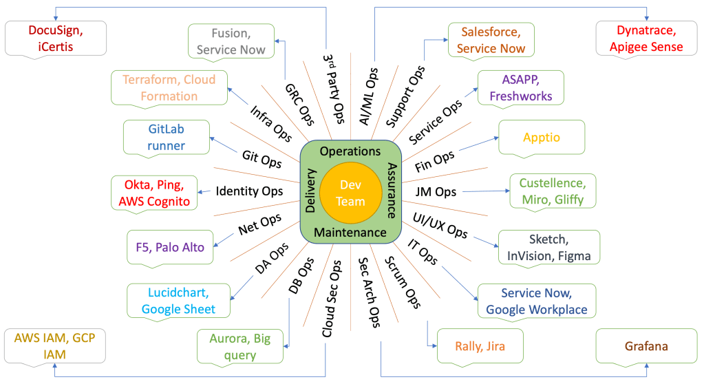 - Identity Ops – Identity is the first leg in most customer journeys. Customer to an enterprise can be their employees or their customers to their product. Different identity solutions are chosen for various applications depending on the needs. The identity solutions help in providing a universal SSO to the customers. Dev teams work with the identity team to extend the solutions not just for authentication but also for authorization using stateless oAuth 2.0 standards.