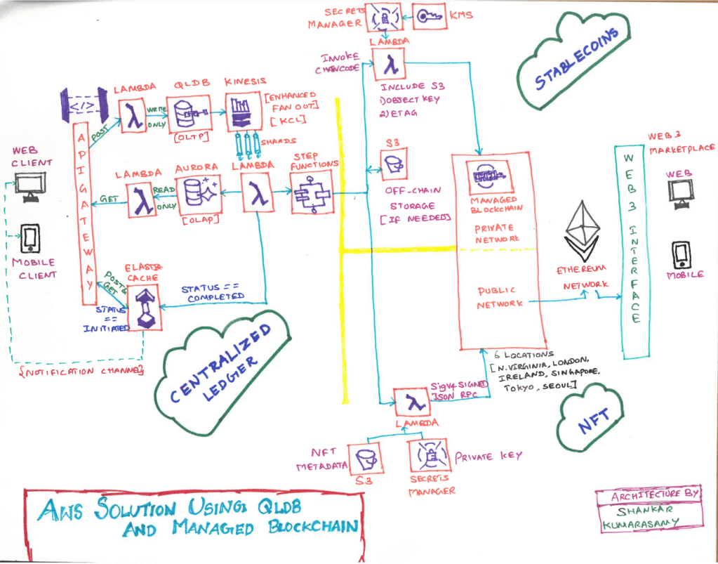 NFT’s provide a way for enterprises to share their digital assets with their customers. Enterprises also open an NFT marketplace for their customers where they can exchange the NFT with other customers. Think of digital industries refurbished business, the digital assets can be exchanged without return and refunds. This saves a lot of time for the enterprise. Also, it provides satisfaction for the buyer that it comes with the same guarantee that the enterprise provided for the first owner. The utility is just changed from one owner to another. Using AWS Managed Blockchain NFTs can be minted on a public blockchain network like Ethereum by securely storing the NFT metadata in S3 and private key in KMS and Secrets Manager.