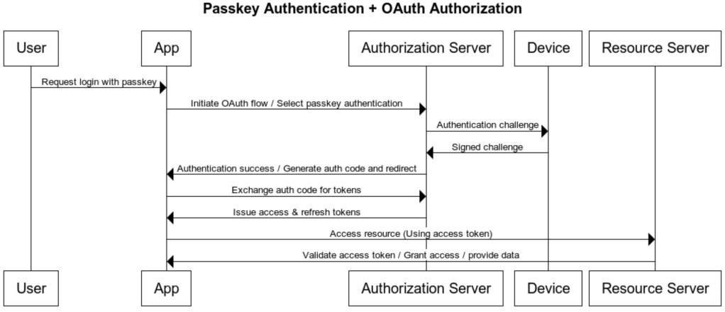 - Authentication: The user authenticates themselves to their device (using a biometric or PIN) to unlock the private key, which is then used to sign a challenge from the service, verifying their identity.