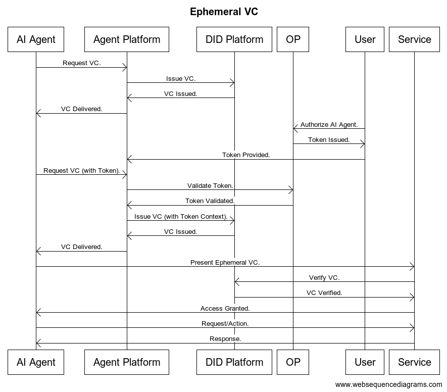- Ephemeral Credentials: For enhanced security, AI agents can generate ephemeral VCs that are valid only for a specific task or time period.