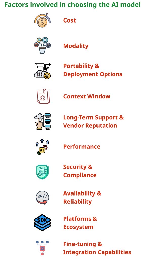 Therefore, selecting the right base or foundation model is crucial in establishing the right AI journey and transformation. What are the factors that we need to consider while choosing the base model?
